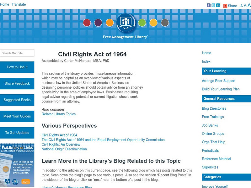 This site from the Cornell University School of Law provides an overview of civil rights legislation, including an explanation of the Civil Rights Act of 1964. There are links to other sites on the subject of civil rights in general.