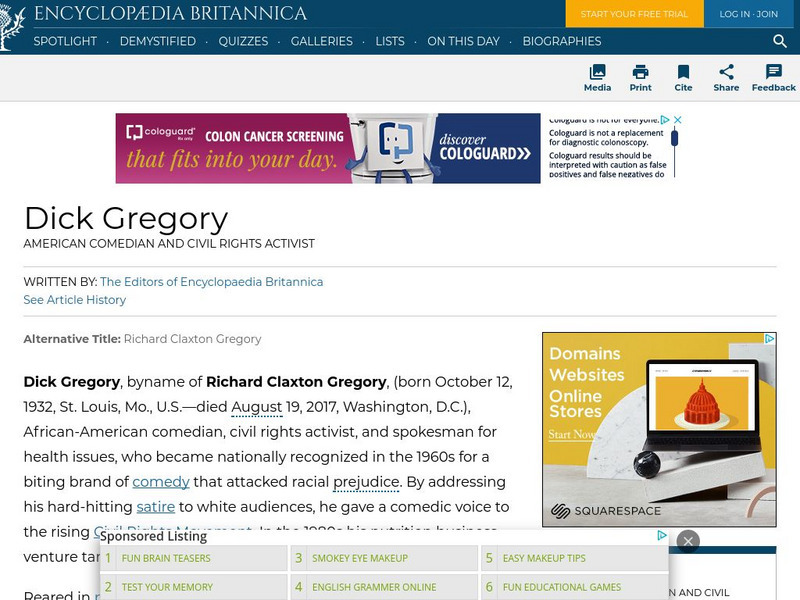 This entry from Encyclopedia Britannica features Dick Gregory, an African-American comedian, civil rights activist, and spokesman for health issues, who became nationally recognized in the 1960s for a biting brand of comedy that attacked...