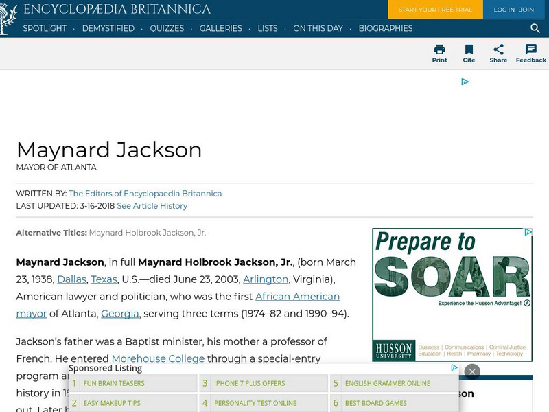 This entry from Encyclopedia Britannica features Maynard Jackson, an American lawyer and politician, who was the first African-American mayor of Atlanta, Georgia, serving three terms (1974-82 and 1990-94).