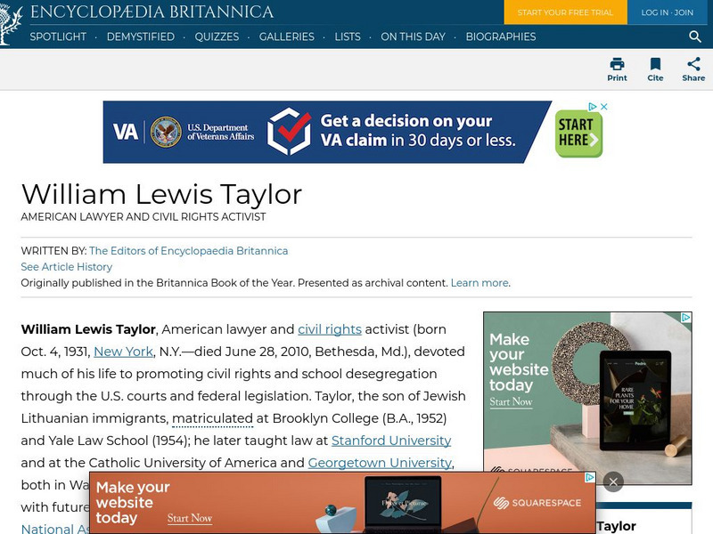 This entry from Encyclopedia Britannica features William Lewis Taylor, an American lawyer and civil rights activist born Oct. 4, 1931, New York, N.Y.