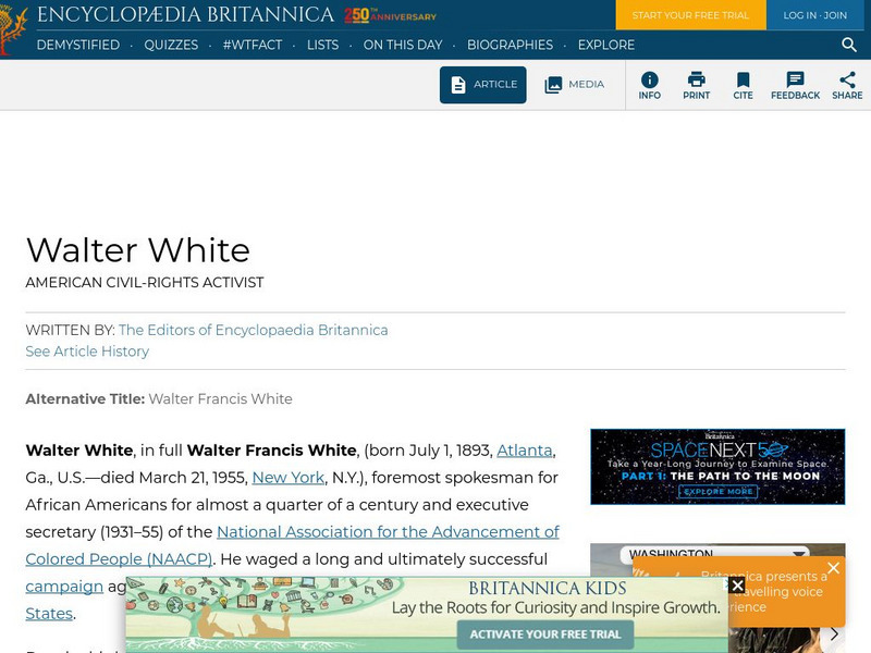 Learn about the life of Walter White, foremost spokesman for African Americans for almost a quarter of a century and executive secretary (1931-55) of the National Association for the Advancement of Colored People (NAACP).