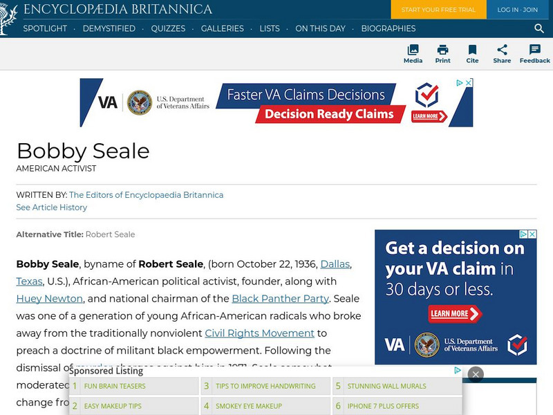 Learn about the life of Bobby Seale, African-American political activist, founder, along with Huey Newton, and national chairman of the Black Panther Party. Seale was one of a generation of young African-American radicals who broke away...