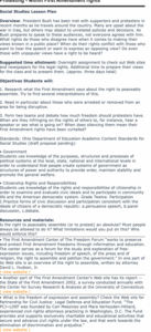 Students research the First Amendment and what it says about the right to peaceably assemble as well as read in particular about those who were arrested or removed from an area for being disruptive during a protest on the War in Iraq....