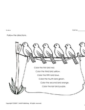 In this following directions worksheet, students color 6 birds 6 different colors by following the instructions underneath the birds. A very good basic skills worksheet.
