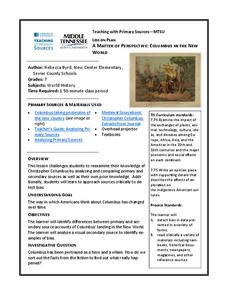 Eighth graders study the famous explorer Christopher Columbus. In this World History lesson plan, 8th graders analyze and compare primary and secondary sources. Students discuss as a class the accomplishments of Columbus....