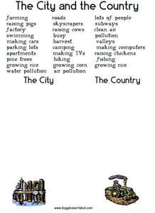 In this comparing and categorizing worksheet, learners use the vocabulary words listed to compare and then categorize city life and country life.