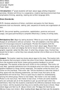 Third graders examine a variety of information about eggs. They complete a class KWL chart, and read "Green Eggs and Ham" and "The Eggs Are Hatching" by Monica Incisa and discuss the fictional and non-fictional aspects of each book. In...