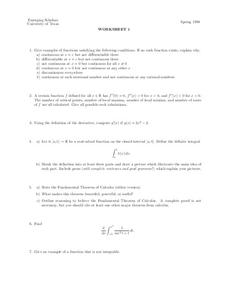In this math worksheet, students give examples of functions that will satisfy given conditions. Students tell the tabulations for a given function. Students use the definition of a derivative to compute the inverse of a function. they...