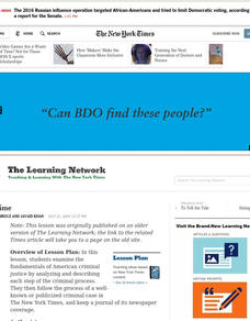 Young scholars examine fundamentals of American criminal justice by analyzing each step of the criminal process. They follow the process of a well-known or publicized criminal case in The New York Times, and keep a journal of its...