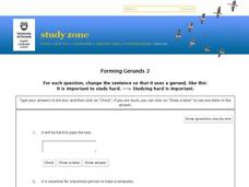 In this using gerunds worksheet, students must rewrite sentences using gerunds. Students can check their answers or get hints to help them in this interactive worksheet.