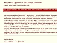 In this compound interest activity, students solve 1 word problem about compound interest. Students determine the amount of money two men have to retire given two different saving scenarios.