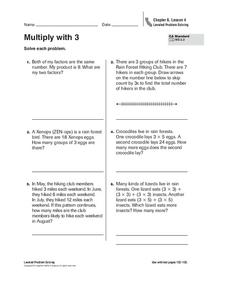 In this multiplication practice worksheet, students sharpen their problem solving skills as they solve 6 story problems that require them to multiply with 3.
