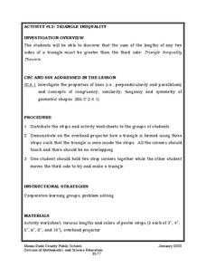 Students discover that the sum of the lengths of any two sides of a triangle must be greater than the third side. They are shown how a triangle is formed using three strips such as that the triangle is seen inside the strips.