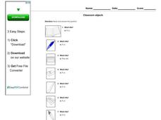 For this vocabulary worksheet, students identify the pictures of eight classroom objects. The worksheet includes an illustration of the object and the question "What's this?" They write the word that finishes the answer, "It's a..." This...