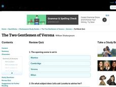 In this online interactive reading comprehension worksheet, students respond to 25 multiple choice questions about Shakespeare's The Two Gentlemen of Verona. Students may submit their answers to be scored.