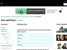 In this online interactive reading comprehension worksheet, students respond to 25 multiple choice questions about Leo Tolstoy's War and Peace. Students may submit their answers to be scored.