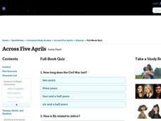 In this online interactive reading comprehension activity, students respond to 25 multiple choice questions about Irene Hunt's Across Five Aprils. Students may submit their answers to be scored.