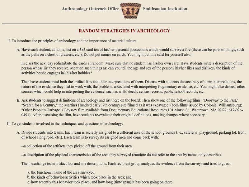 Students participate in a three-part archeological interpretation activity. First, they learn the principles of archaeology and the importance of material culture, and then they question ideas and interpret artifact evidence. Finally,...