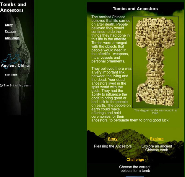 An engaging site that features ancient China's beliefs of afterlife. Students can explore an ancient tomb and learn about its important artifacts. There is also an ancient Chinese story and a game about the tomb.