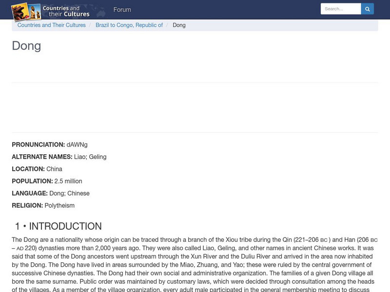 Provides an overview of the traditional culture and lifestyle of the Dong of China. Gives basic facts about location, language, folklore, foods, social customs, family life, education, religion, pastimes, societal challenges, etc. (Note:...