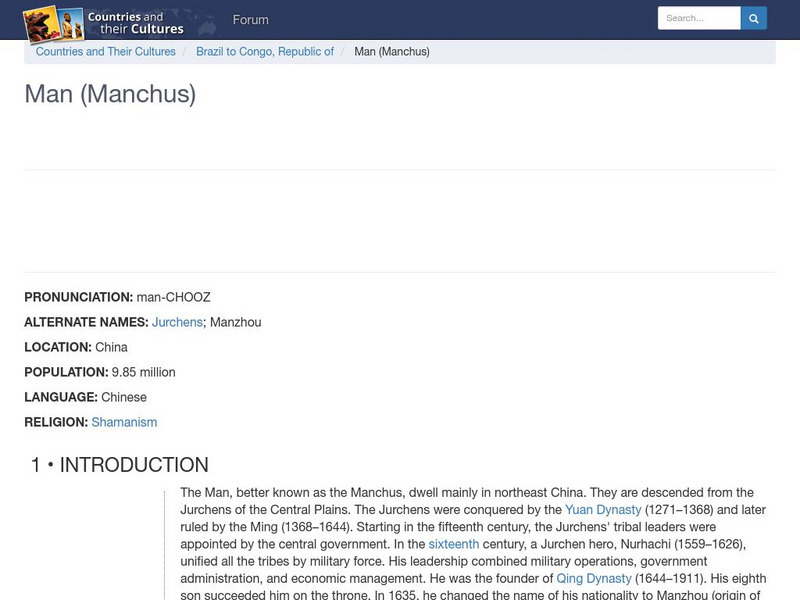 Provides an overview of the traditional culture and lifestyle of the Manchus of China. Gives basic facts about location, language, folklore, foods, social customs, family life, education, religion, pastimes, societal challenges, etc....