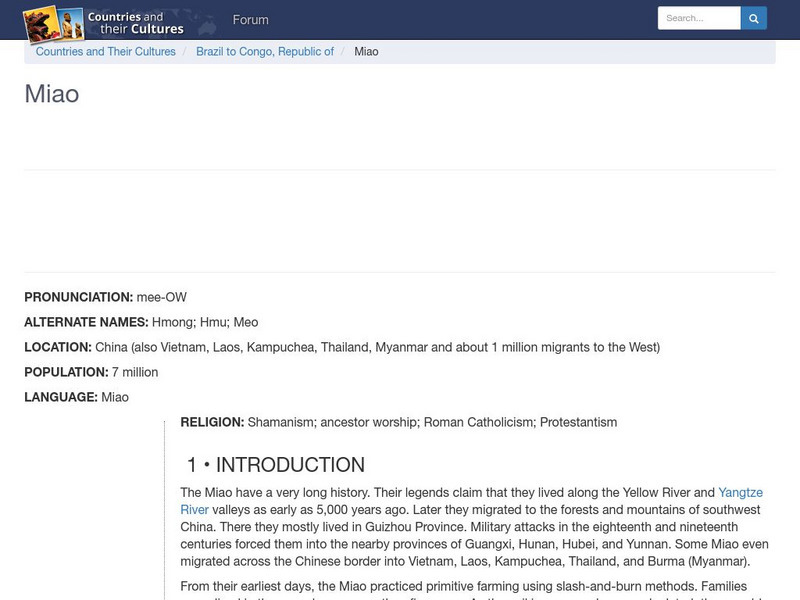 Provides an overview of the traditional culture and lifestyle of the Miao who live mainly in China. Gives basic facts about location, language, folklore, foods, social customs, family life, education, religion, pastimes, societal...