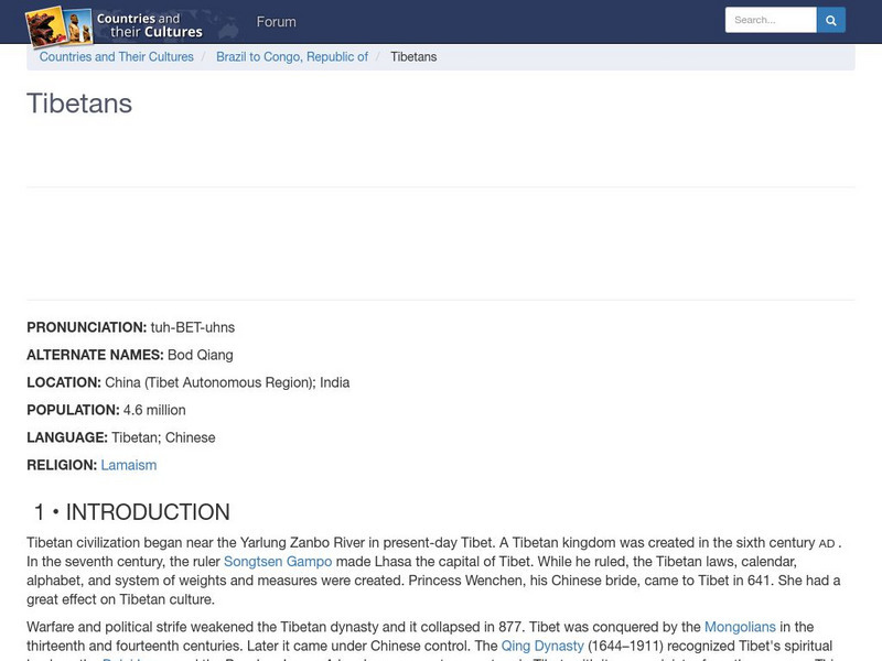 Provides an overview of the traditional culture and lifestyle of Tibetans. Gives basic facts about location, language, folklore, foods, social customs, family life, education, religion, pastimes, societal challenges, etc. (Note: Content...