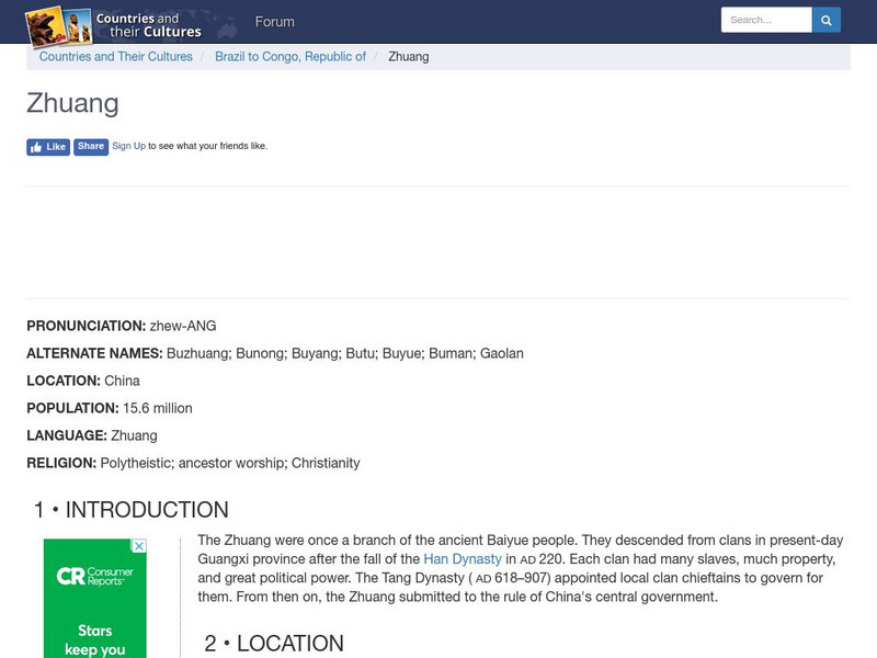 Provides an overview of the traditional culture and lifestyle of the Zhuang of China. Gives basic facts about location, language, folklore, foods, social customs, family life, education, religion, pastimes, societal challenges, etc....