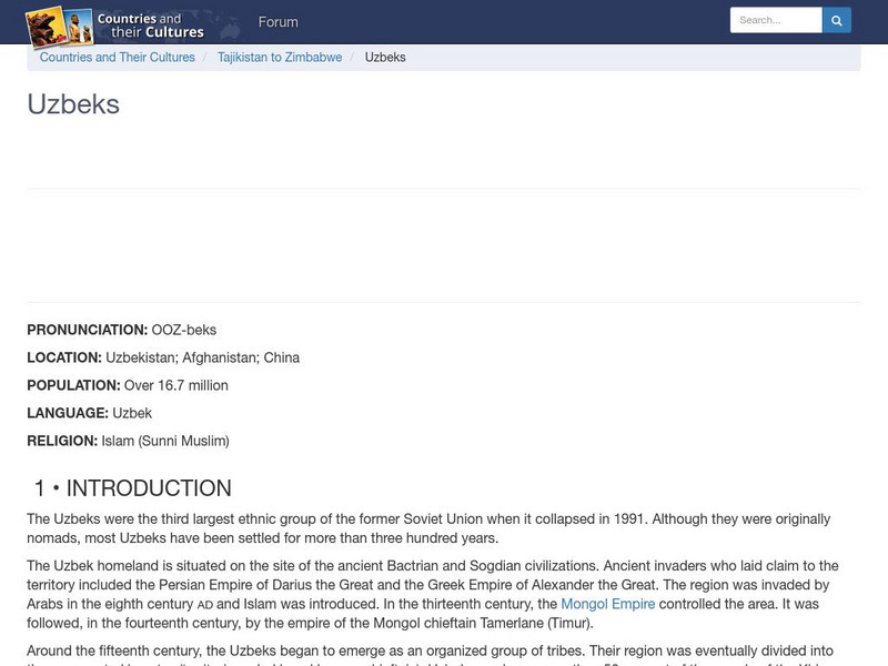 Provides an overview of the traditional culture and lifestyle of the Uzbeks in Uzbekistan, Afghanistan, and China. Gives basic facts about location, language, folklore, foods, social customs, family life, education, religion, pastimes,...