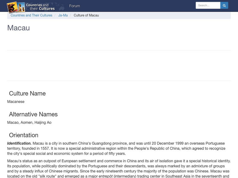 Provides an overview of the culture of the Macau Special Administrative Region in China. Gives basic information on topics such as geography, ethnic makeup, languages, symbolism, economy, food, customs, social stratification, family...