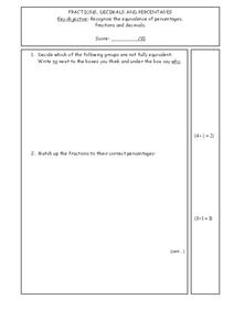 In this fractions, decimals and percentages worksheet, students identify equivalent integers. They convert numbers from fractions to decimals and percents. This two-page worksheet contains 11 problems.