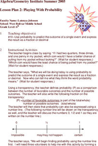 Sixth graders investigate probability. They use ratios to solve simple probability situations. Students express their solutions in the form of fractions or decimals. They predict outcomes and complete probability worksheets.
