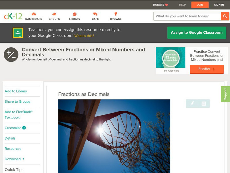 This site contains example problems that explain the steps for converting fractions to decimals. Students can practice the skill and check their answers immediately.