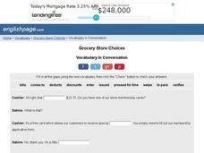 For this online interactive English vocabulary skills worksheet, students answer 10 fill in the blank questions regarding grocery-related terms. Students may submit their answers to be scored.