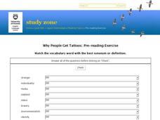 In this synonym worksheet, students choose the correct synonym definition for a set of vocabulary words that they will encounter in the article "Why People Get Tattoos." Ten words are included in the exercise.