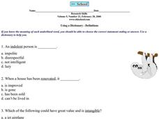 In this definition worksheet, middle schoolers choose the correct definition from a choice of three definitions. The students are prompted to guess the definition before using their dictionaries to look it up.