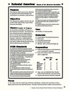 Students examine the causes of the American Revolution. For this colonial America lesson, students read handouts regarding the sequence of events that led to the commencement of the war. Students complete the provided worksheets and...