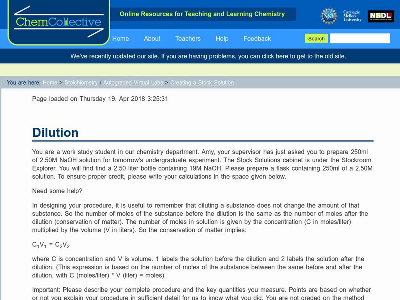 In this activity, students use the virtual lab to create dilute solutions from a concentrated stock solution of acids or bases. They must first calculate the correct volumes of concentrated acid solution and water to mix together to...