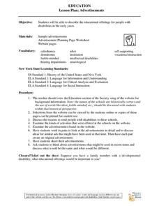 Students explore educational offerings for people with disabilities. In this social studies lesson, students research early schools for people with disabilities and discuss the advertisements that were used at the time. Students create...