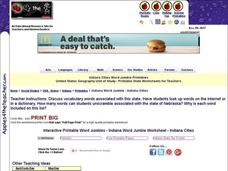 In this Indiana word jumble worksheet, students examine 10 cities listed in a word bank. Students use the word bank to unscramble 10 sets of letters to spell the names of 10 Indiana cities.