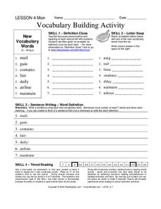 In these vocabulary building worksheets, students learn the vocabulary words by completing the four pages of activities that include definition clues, word scrambles, sentence writing, and timed readings.