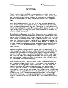 For this hermit crabs worksheet, students utilize an article about hermit crabs and a dictionary to find the definitions to 11 vocabulary words and answer 9 questions about hermit crabs in complete sentences.