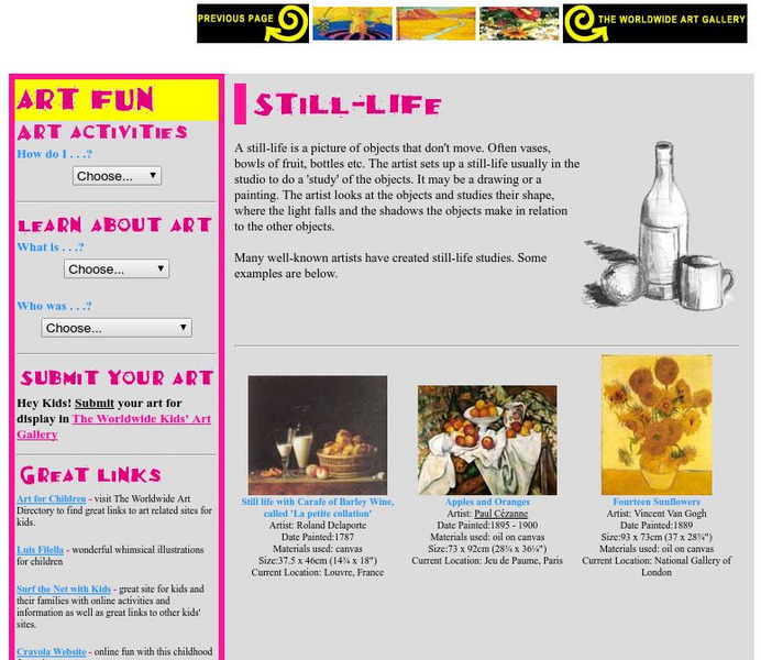 This site breaks down the art of drawing into six subcategories, each encompassing a different drawing medium. Mediums include chalk, charcoal, crayon, ink, metalpoint, and pencil. Each subcategory has many visual examples.