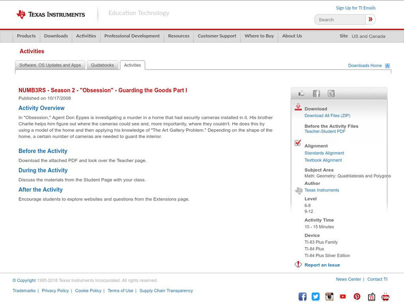 Based off of the hit television show NUMB3RS, this lesson introduces students to the Art Gallery Problem, in which the number of guards necessary to guard a two-dimensional space (the "art gallery") must be found. This lesson keeps the...