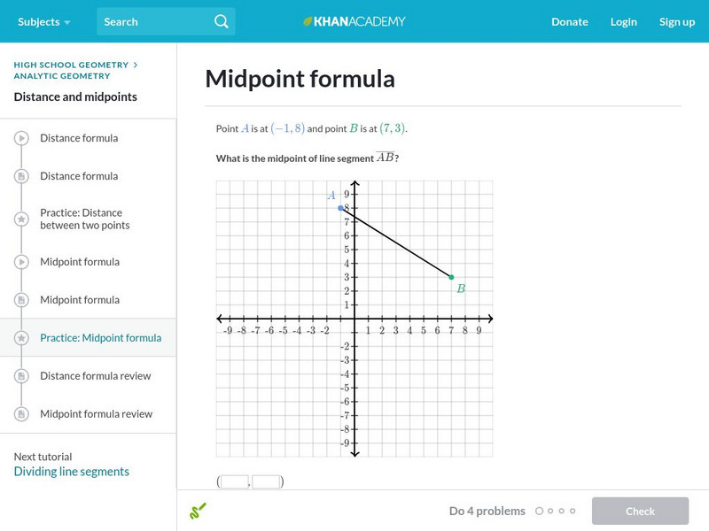 Find the midpoint of a segment on the coordinate plane, or find the endpoint of a segment given one point and the midpoint. Students receive immediate feedback and have the opportunity to try questions repeatedly, watch a video or...