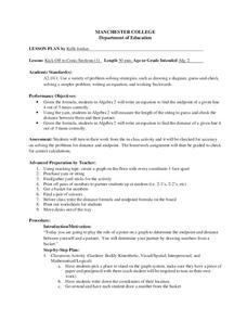 Students use the Pythagorean formula to find the length of a line. Afterward, they explore the midpoint formula to determine the midpoint of a line with a non-zero slope on a coordinate plane. Students complete assigned problems and...