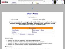 Students identify the latitude and longitude of various locations and calculate the distance between two given coordinate points. They read an eBook, explore the City Zen program, and complete a worksheet.
