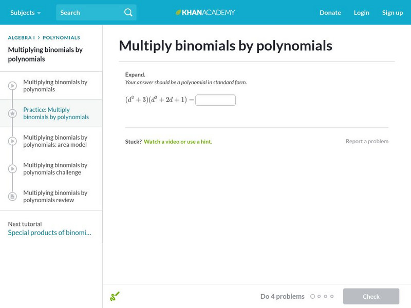 Use the distributive property to express the product of a binomial and a polynomial as a single polynomial. Students receive immediate feedback and have the opportunity to try questions repeatedly, watch a video or receive hints.