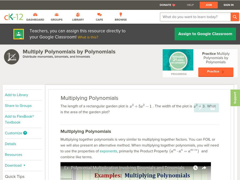 [Free Registration/Login may be required to access all resource tools.] This lesson covers multiplying polynomials. Students examine guided notes, review guided practice, watch instructional videos and attempt practice problems.