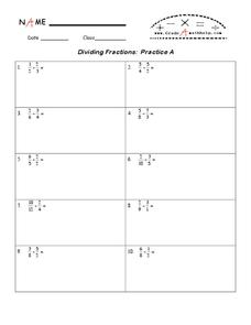 For this dividing fractions worksheet, students solve 10 different problems that include various fractions. First, they multiply the number by the reciprocal of the fraction shown. Then, students simplify the resulting fraction if...